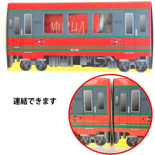 AT-700形「AIZUマウントエクスプレス号」の中には、会津銘菓「武者煎餅」を使ったクランチチョコが6枚入っています。チョコクランチマウントエクスプレス、花サクッとラスクのパッケージはそれぞれ連結ができるようになっています。